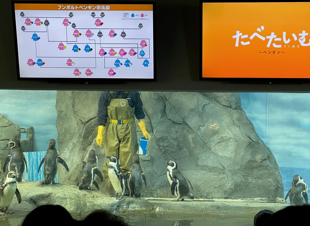 ペンギンの食事。ご飯を食べようと急ぎながら、走る姿は可愛らしさ全開です。